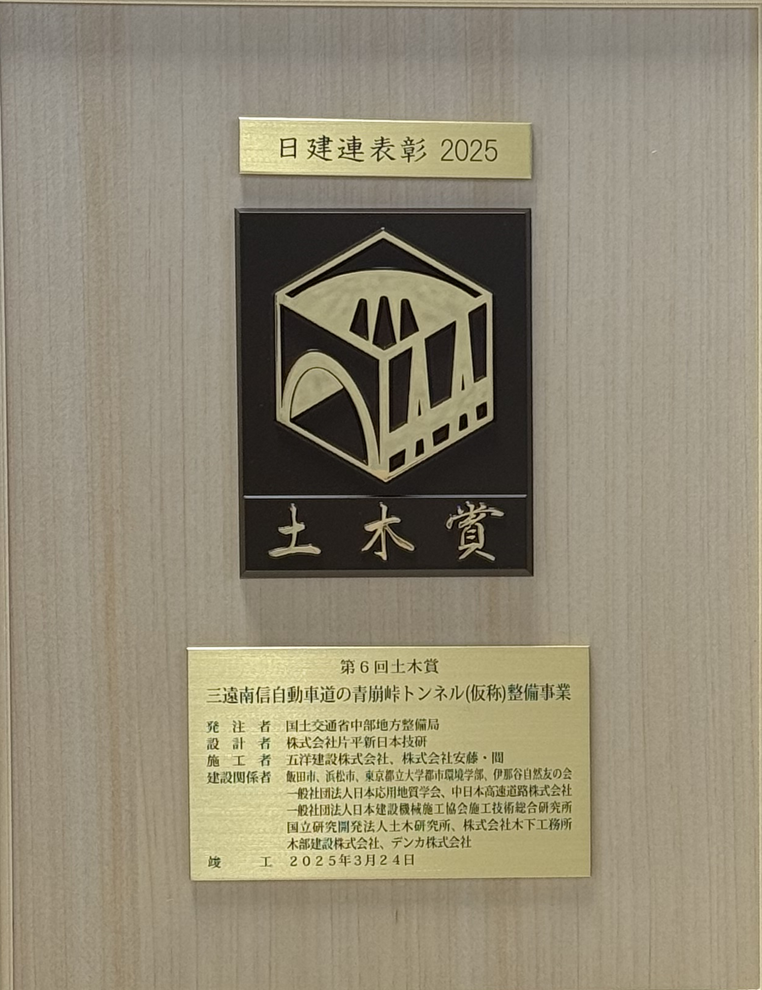 2025年12月02日 日建連表彰 土木賞を受賞しました この度、日建連表彰2025 第6回土木賞にて、弊社施工の三遠南信自動車道の青崩峠トンネル(仮称)整備事業が選ばれました。 弊社施工部分 「平成30年度三遠南信自動車道 小嵐(こおろし)トンネル本坑工事 トンネル延長 L=2,854m」 https://www.nikkenren.com/doboku/prize/award/article/efLUvDmPIVWceOGWbPLnWjH